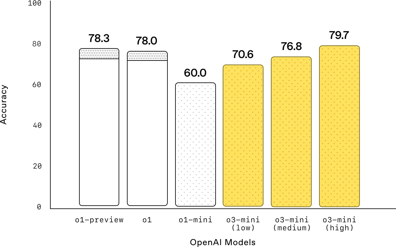 - o3-mini-high๋ ๋ฐ์ฌ ์์ค์ ์๋ฌผํ, ํํ, ๋ฌผ๋ฆฌํ ๋ฌธ์ ์์ 77.0% ์ ํ๋๋ฅผ ๋ฌ์ฑํ๋ฉฐ, ์ด์ ๋ชจ๋ธ๋ณด๋ค ํฌ๊ฒ ํฅ์๋จ.