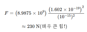 ✅ 쿨롱 반발력은 약 230N, 강한 핵력은 그보다 100배 이상 강한 10^{13} N 수준.