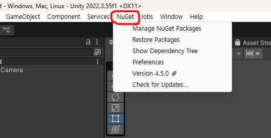 그리고 유니티를 껐다가 다시 켜면, 이렇게 NuGet 탭이 생긴다